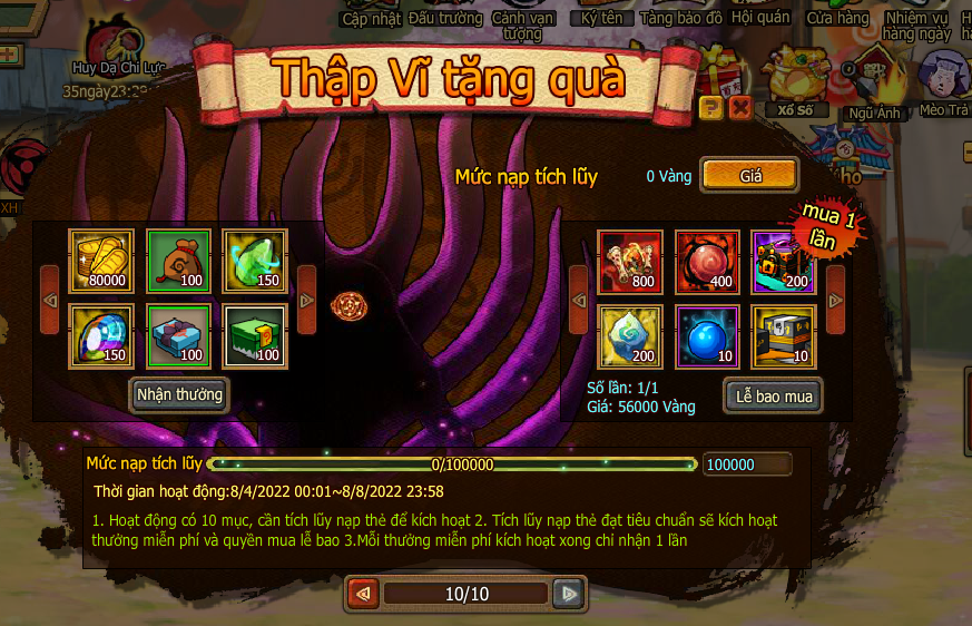 3. Tích lũy nạp đạt 10000 vàng , nhận đại lễ tích lũy nạp