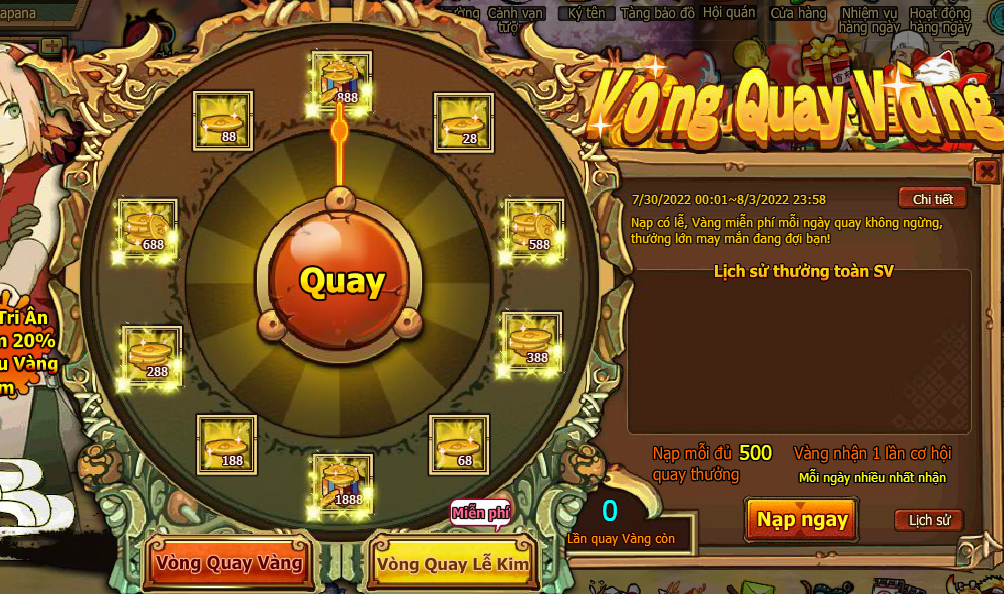 1. Trong thời gian event , người chơi nạp đủ 1000 vàng nhận 1 lần cơ hội quay ( vòng quay vàng )