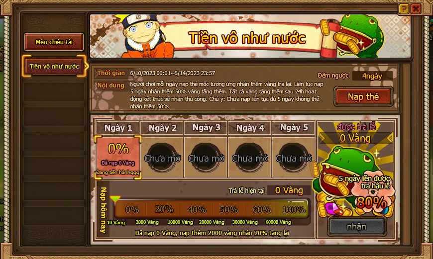 1. Người chơi mỗi ngày nạp thẻ mốc tương ứng nhận thêm vàng trả lại. Liên tục nạp 5 ngày nhận thêm 80% vàng tặng thêm. Tất cả vàng tặng thêm sau 24h hoạt động kết thúc sẽ nhận thủ công. Chú ý: Chưa nạp liên tục đủ 5 ngày không thể nhận thêm 80%.
