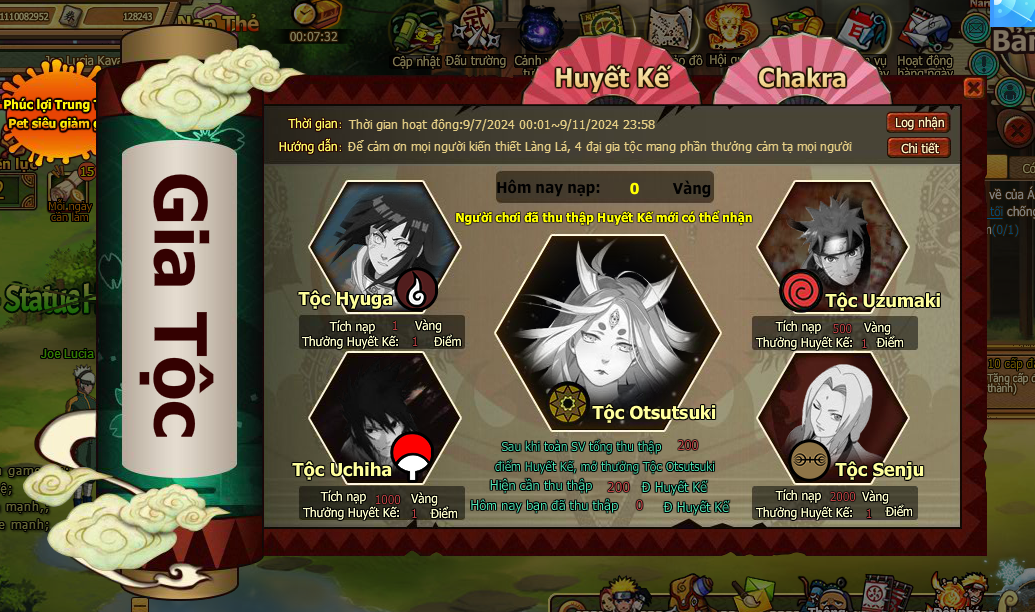 1. Trong thời gian hoạt động mỗi ngày tích lũy nạp đủ mốc tương ứng, mở 4 đại gia tộc, nhận thưởng Huyết kế tương ứng. 4 đại gia tộc gồm: Tộc Hyuga, Tộc Uzumaki, Tộc Uchiha, Tộc Senju.