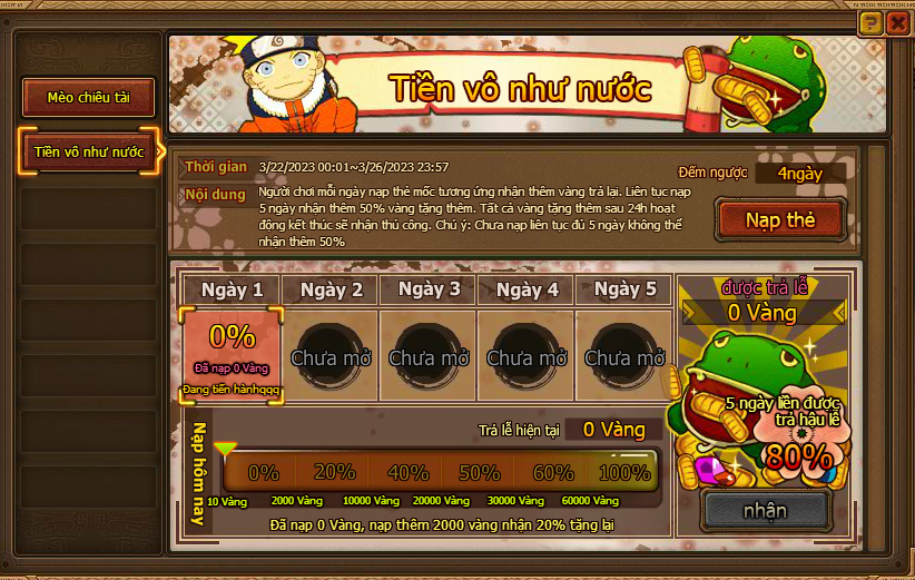1. Người chơi mỗi ngày nạp thẻ mốc tương ứng nhận thêm vàng trả lại. Liên tục nạp 5 ngày nhận thêm 80% vàng tặng thêm. Tất cả vàng tặng thêm sau 24h hoạt động kết thúc sẽ nhận thủ công. Chú ý: Chưa nạp liên tục đủ 5 ngày không thể nhận thêm 80%.