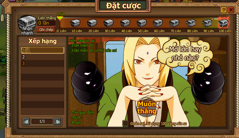 2. Thi đấu bắt đầu khi người chơi điểm số mình lớn hơn hay nhở hơn điểm của Tsunade, nhấn vào nút Lớn hoặc Nhỏ.