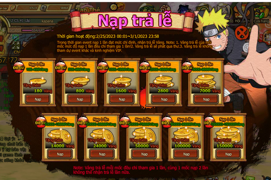 Vàng trả lễ của mỗi mốc mức độ nạp 1 lần đều chỉ tham gia 1 lần
