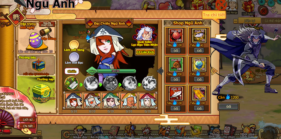 7. ở [Shop Ngũ Ảnh] tiêu [Tinh hồn] đổi các loại đạo cụ, và Ninja mới [Reanimated Hanzou] đợi bạn chiêu mộ.