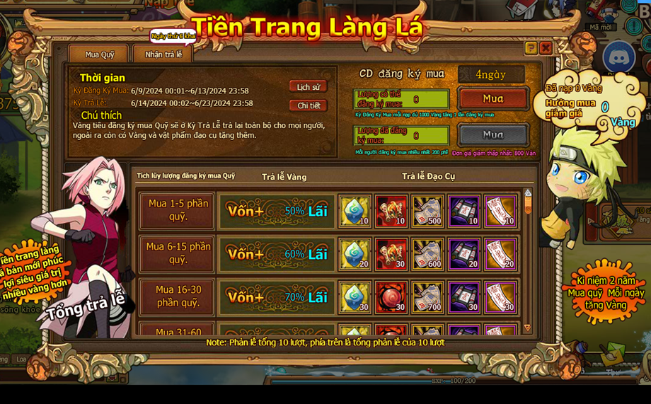 Người chơi căn cứ số phần mua Quỹ mỗi ngày nhận 1 lần Quỹ thưởng trả lễ , trả lễ bao gồm trả lễ vàng và đạo cụ