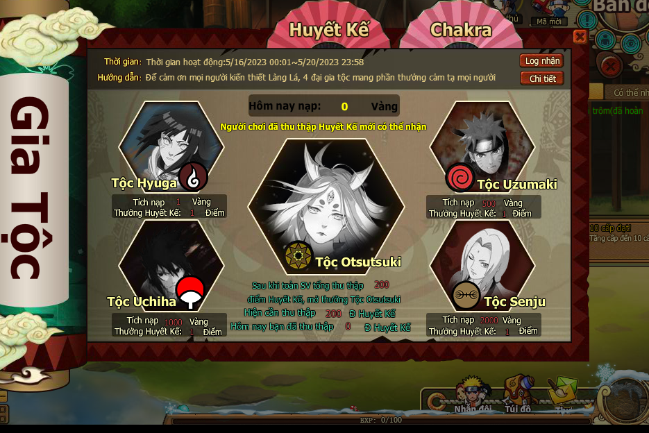 5. Mỗi ngày nhận tối đa 4 loại, cách ngày 0h làm mới, Liên SV thu thập lượng "Huyết Kế" làm mới, trạng thái nhận đại LB Tộc Otsutsuki ở giữa làm mới.