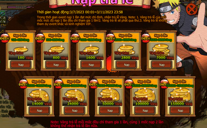 Vàng trả lễ của mỗi mốc mức độ nạp 1 lần đều chỉ tham gia 1 lần